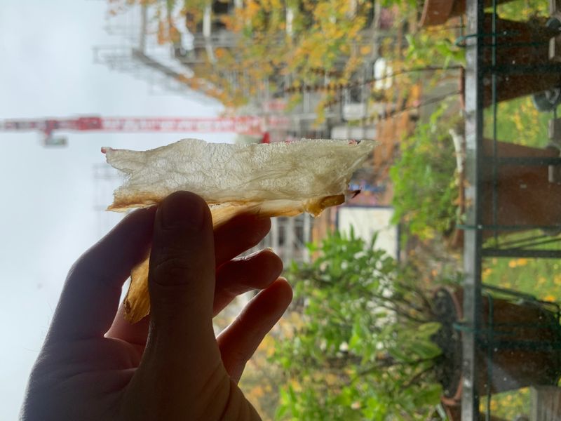 Rolled with the silicon mat. That means that I could roll without any flour. The rolling takes more time. For freezing, I covered the dough with a black reusable plastic baking foil.